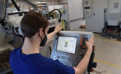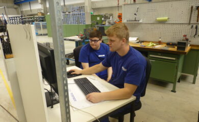 Bei unseren Azubi Projekten, die wir regelmäßig ins Leben rufen, dürfen unsere Auszubildenden selbst die Verantwortung für ein Projekt übernehmen. Dabei geht es um eine Aufgabenstellung, die die Azubis nur gemeinsam lösen können. Nachdem das Projektthema „Bau eines Tischkickers“ festgelegt wurde, machte sich Moritz, der technische Produktdesigner an die Arbeit und erstellte mithilfe des CAD-Pro- gramms ein 3-D-Modell des Kickers in verschiedenen Ausfertigungen. Er musste hier bereits den Aufbau sowie das Innenleben, unter anderem die Ballrückführung, überlegen. Zusammen mit den Projektleitern Marques und Leon besprach er des Weiteren, welche Zukaufteile benötigt werden und was wir selbst fertigen können.