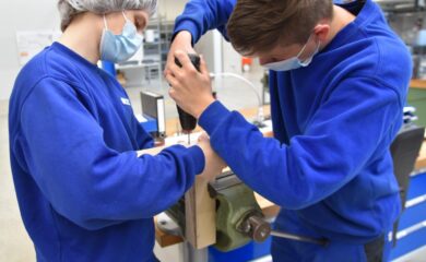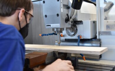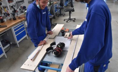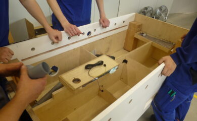 Innerhalb der zweiten Projektwoche stand das Zusammenbauen des Kickers an, indem die Außenplatten miteinander verschraubt und das Innenleben eingesetzt wurde. Hierzu zählten unter anderem die Rohre für die Ballrückführung, die im Nachhinein nochmal perfektioniert werden mussten, da diese nicht schräg genug waren. Für die Elektroausstattung bohrten die Azubis Löcher für die Kabelleitungen und brachten Steckdosen am Kicker an. Danach brachten sie die LED-Lichter an, darauffolgend die Toranzeige, die Lautsprecher und die USB-Ports. Zum Schluss entgrateten sie die Kanten und polierten das Ergebnis.