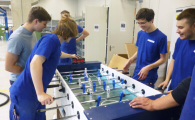 Der Kicker war Punkt 11.30 Uhr fertiggestellt und somit einsatzbereit für das erste Spiel. Mit musikali- scher Begleitung, die über die eingebauten Musikboxen am Kicker kam, weihten die Azubis den Kicker in einem ersten Spiel ein. Um das erfolgreiche Ende des Azubi-Projekts zu feiern, wurde am Grillplatz von Heinlein bei optimalen Wetterbedingungen mit Würstchen und Steak gemeinsam gegrillt.